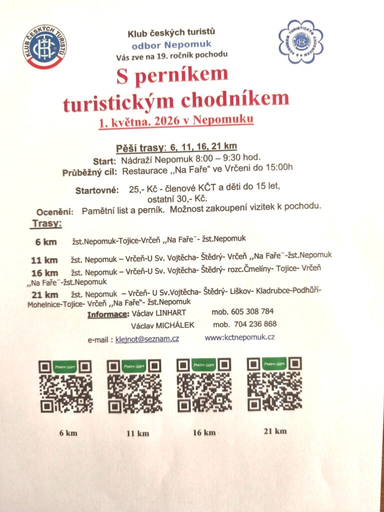 Trasy 6, 11, 16, 21 km, pořádá KČT Nepomuk