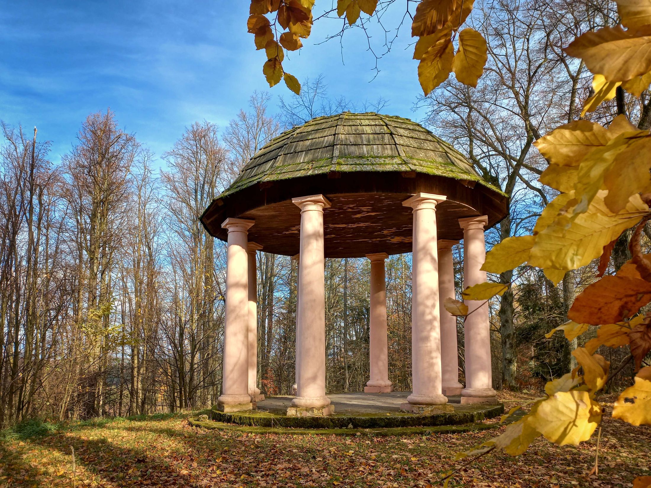 Cesta z Nepomuku vede kolem Vražedného rybníka a bývalé obory na Silově s rozsáhlou semennou plantáží modřínů. Na rozcestí Františkov se napojíte na žlutou trasu. Gloriet na vrchu Františkově u Žinkov, lidově nazývaný „Templem“, je napodobeninou antického chrámu z 19. století. Sloužil jako místo pikniků a loveckých zastavení majitelů žinkovského panství. Pod Glorietem narazíte na skupinku obrovských, různě poskládaných žulových balvanů. Podle pověsti je zde snad i brána do pekel! Opodál můžete v lese najít základy obvodových zdí s příkopy a valy Hradu Potštejn (Půtův kámen) z poloviny 13. století. Pak už vás cesta dovede až k romantické perle jižního Plzeňska: zámek Žinkovy.